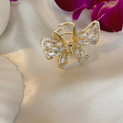 Jewelry Claw Clip: This medium sized golden butterfly claw clip is studded with American diamonds. It will help you elevate your hairstyle for any special event effortlessly.