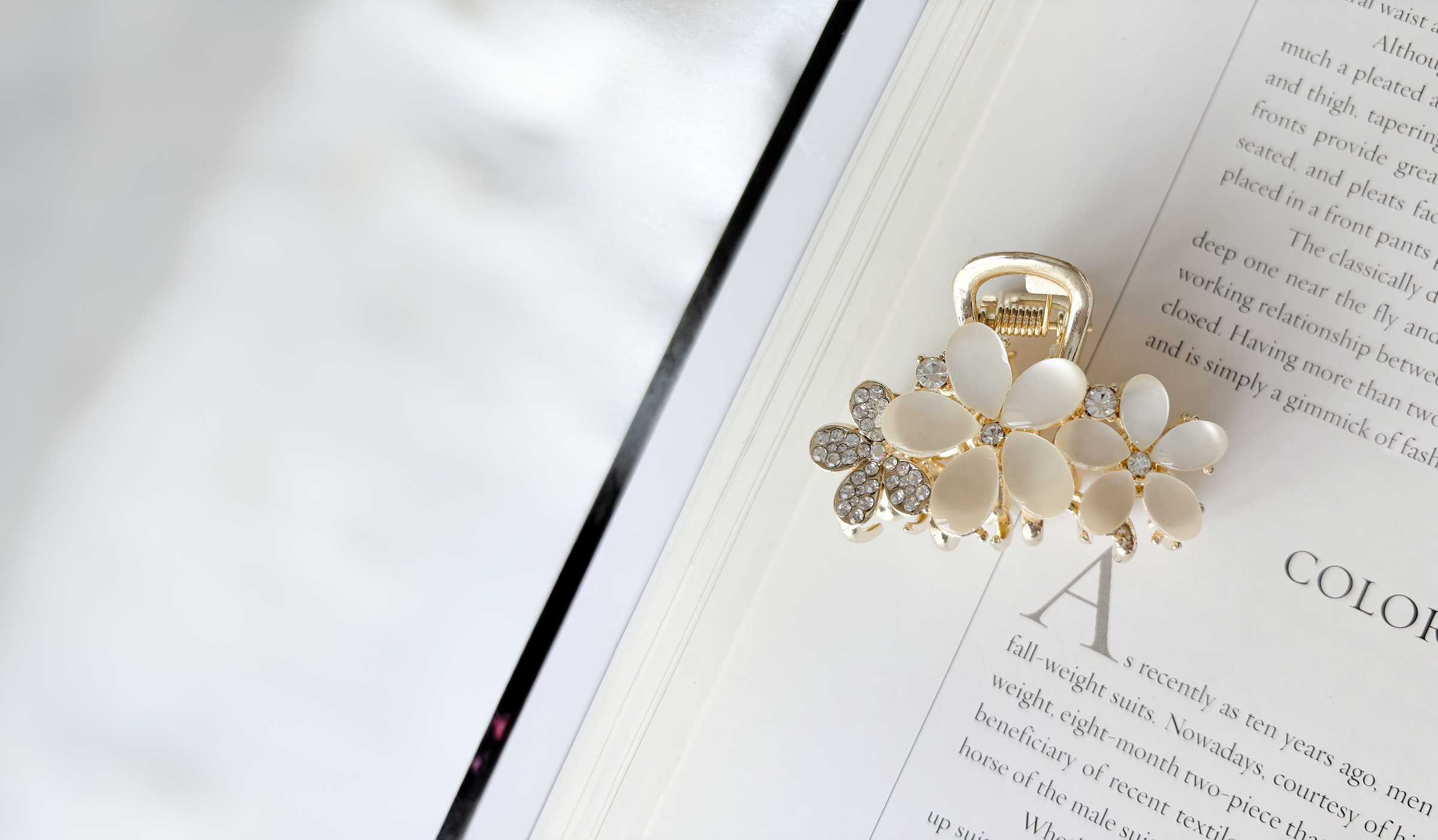 Jewelry Claw Clip: This small sized golden claw clip with diamonds & periwinkle shaped pearls will help you elevate your hairstyle for any special event effortlessly.